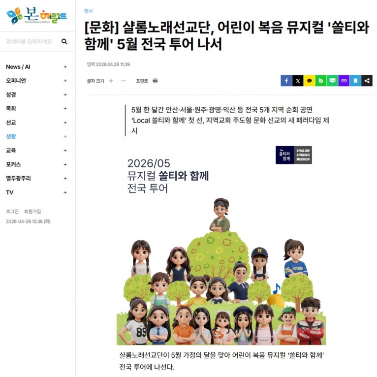 [기사] 샬롬노래선교단, 어린이 복음 뮤지컬 '쏠티와 함께' 5월 전국 투어 나서(본헤럴드)