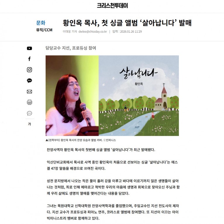 뮤직타임 [기사] 황인옥 목사, 첫 싱글 앨범 ‘살아납니다’ 발매(크리스천투데이)