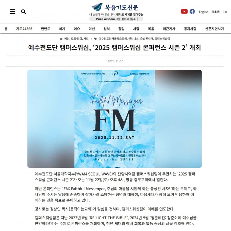 [기사] 예수전도단 캠퍼스워십, ‘2025 캠퍼스워십 콘퍼런스 시즌 2’ 개최(복음기도신문)