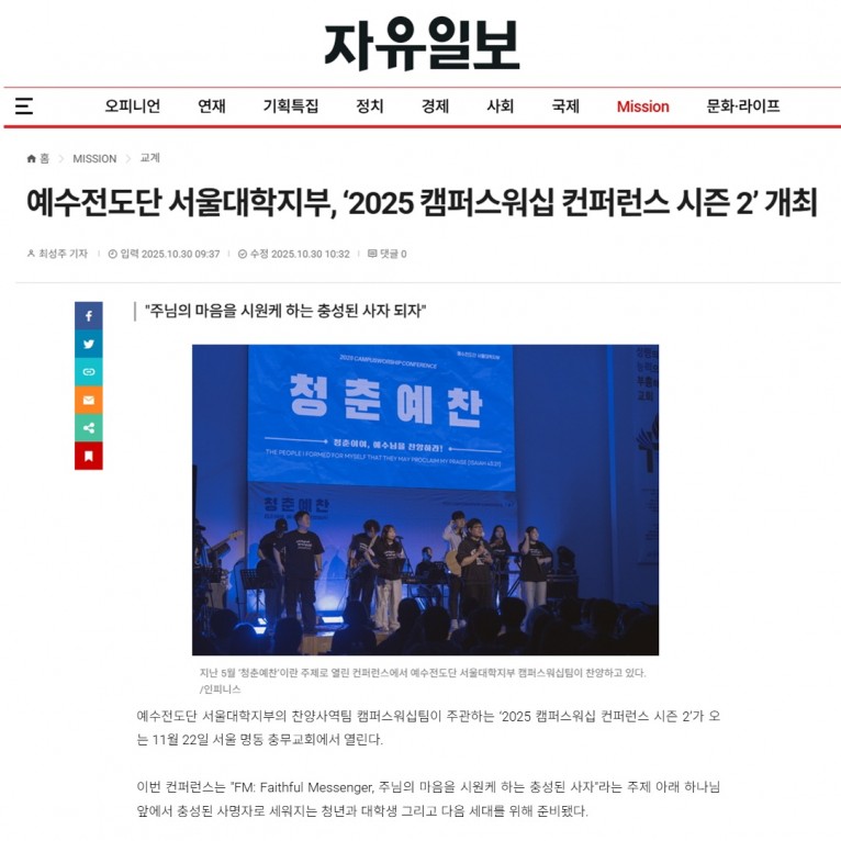 [기사] 예수전도단 서울대학지부, ‘2025 캠퍼스워십 컨퍼런스 시즌 2’ 개최(자유일보)